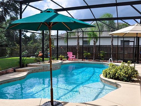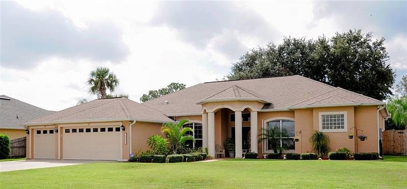 Brevard County, Port St. John. Custom built home, three bedroom w/Den, three bath. Custom kitchen with Corian countertops on huge open kitchen, stainless appliances, 42'' custom cabinets, tile floors throughout living area, two walk-in closets, two triple sliding glass doors opening to pool. Double pane windows installed. Sparkling salt water pool. Beautiful Flora Vista sub division, located near Fay Lake Park. Close to I-95 for easy access to the Beaches or to Orlando Fl. Very nice modern home on .36 acres. 4 bedroom, (or 3 bed plus office) 3 bath, 3-car garage, 2348 living sq. ft. (3600 sq. ft under roof) in Flora Vista sub division. Located in Brevard County, Port St. John. This home offers a well-lit, split floorplan that begins with an double-door entry that gives way to an impressive entry with view of pool. 10' volume ceiling thru-out and custom built in features, plant shelves. The kitchen offers 42” upper cabinetry w/ counter lighting, solid surface counters, stainless appliances, pantry, desk area and breakfast nook with a seamless bay window overlook