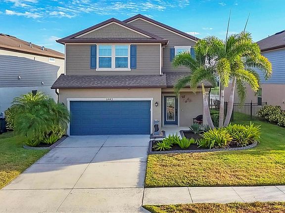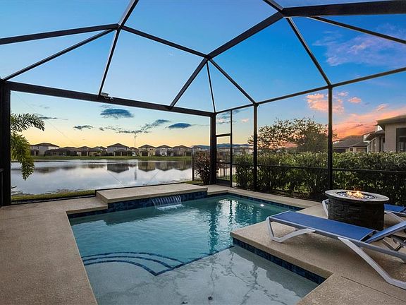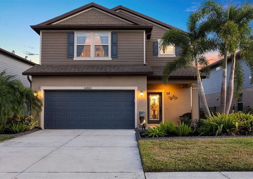 Set within the desirable Trevesta community in Palmetto, this two-story coastal-style home offers comfort, functionality, and a touch of Florida charm. The freshly landscaped exterior and glass-detailed front door make a welcoming first impression, leading into a foyer with a chandelier, high ceiling, and tile flooring. The open-concept great room and dining area feature large windows, recessed lighting, a ceiling fan, and soft carpeting for an inviting atmosphere. The kitchen is perfectly designed for everyday living and entertaining with wood cabinetry, granite countertops, and tile flooring. Stainless steel appliances include a Whirlpool microwave and dishwasher, GE double oven with cooktop, and LG refrigerator. Bar-height seating, a closet pantry, and sliders that open to the lanai complete the space. A main-level guest suite offers convenience with a nearby full bath featuring a granite-topped vanity and walk-in shower. Upstairs, a carpeted staircase with storage below leads to a loft that serves as a versatile bonus living area. The spacious primary suite includes two windows, a large walk-in closet, and a luxurious bath with dual sinks, granite countertops, wood cabinetry, a walk-in shower, and a linen closet. Two additional bedrooms, each with walk-in closets, share a full bath with a tub/shower combination and dark vanity with granite countertop. The laundry room, equipped with Samsung washer and dryer, is also located upstairs for added ease. Step outside to your private lakefront retreat, where a covered lanai with ceiling fan and panoramic screen enclosure overlooks the sparkling pool with sun shelf, an ideal setting for quiet mornings or sunset gatherings. The home is equipped with Solar panels with Tesla Powerwall, rechargeable backup battery. Beyond your own backyard paradise, the community delivers resort-style amenities including a pool, splash pad for children, fitness center, playground, and more. The location offers quick access to major highways, making commutes to St. Pete, Tampa, and Sarasota a breeze while putting you near the best of Florida’s dining, shopping, and beaches. This is more than just a home, it’s the lifestyle you’ve been waiting for.