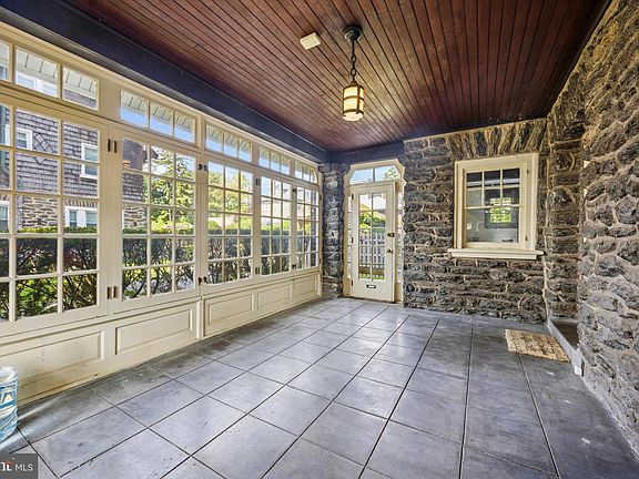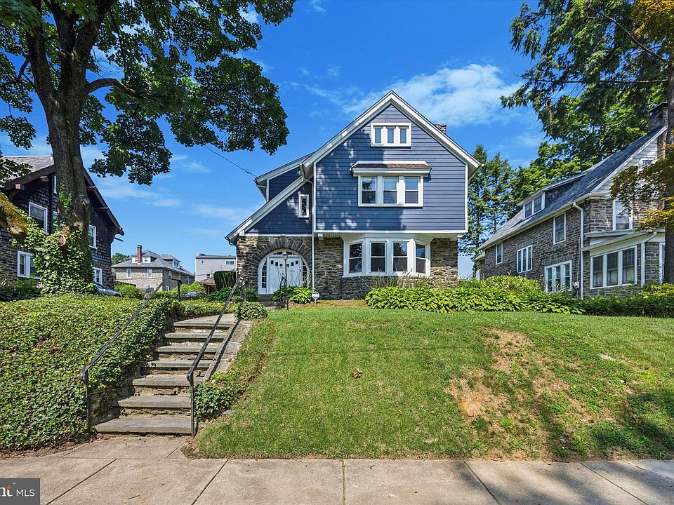 This beautifully maintained 6 bedroom, 2.5 bath Craftsman-style stone home is located on a picturesque, tree-lined street in Oak Lane. It offers approximately 3,700 square feet of living space filled with character and modern updates. Original architectural details, rich hardwood floors, and thoughtfully landscaped grounds with a large deck create the perfect blend of historic charm and comfortable living. Many new windows and low-maintenance Hardie board siding enhance the home’s exterior appeal and efficiency. Step into an enclosed front porch with functioning windows, tiled flooring, and arched stone entryways. From there, enter the main level, where you’ll find a spacious living room with a bay window, recessed lighting, and a gas fireplace framed by an elegant stone and wood mantle. A stunning formal dining room sits adjacent to the eat-in kitchen, which features a farmhouse sink, gas stove, dishwasher, and a generous walk-in pantry. Don't miss the additional built ins for storage in the hallway to the basement. A convenient half bath, laundry room, and additional pantry space complete this level. Upstairs, the second floor offers three spacious bedrooms and a hall bath, including an XL primary suite with a walk-in closet and private ensuite bath. The third floor includes three additional bedrooms. A finished basement with a custom Murphy Bed, spacious workshop and built-in vintage bar expands your living and entertaining options. This home has been carefully maintained with significant updates. There is a private parking spot behind the porch which is accessed through an unofficial agreement with the neighbors. Blending timeless craftsmanship with modern comforts, this Oak Lane gem is ready for its next chapter.