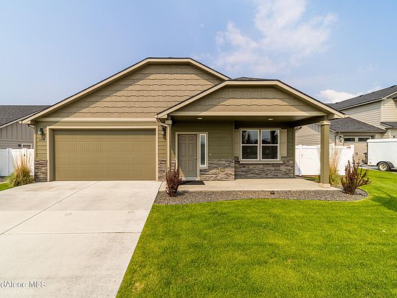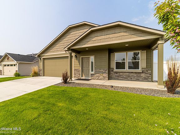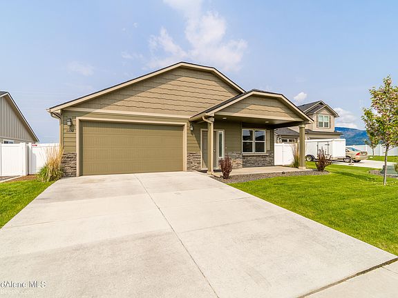Why wait for new construction? This newer beautifully maintained Rancher is ready for new owners. Fully fenced with front yard sprinklers, fruit trees, and raised garden beds. Landscaped backyard with view of Rathdrum Mountain. The kitchen has upgraded cabinets, stainless appliances, granite countertops with a breakfast bar. The main suite has a big closet. The garage is oversized with an 8 foot door opening. House is located in the Brookshire Development.