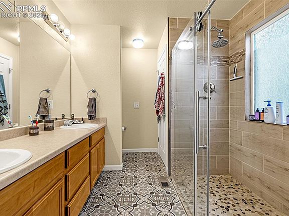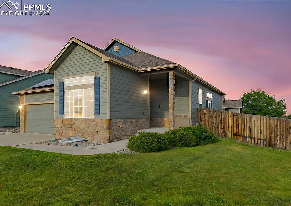 Welcome home to a stunning 5-bedroom, 4-bath, 2-story home featuring over 3,200 finished sq ft in the highly sought-after Painted Sky neighborhood! Perfectly positioned on a fully landscaped corner lot, this residence offers picturesque mountain views and impressive curb appeal with its stone-clad exterior and inviting covered porch. Inside, you’ll be greeted by soaring vaulted ceilings, abundant natural light, and an open, flowing layout designed for both comfort and style. The main level boasts a versatile great room and office, a luxurious primary suite featuring custom tilework, double vanity, and a spacious walk-in closet, along with the convenience of main-level laundry, a half bath, and direct garage access. The kitchen is complete with stainless steel appliances, a breakfast bar, generous cabinet space, and a walk-in pantry, opening into the dining and living areas for seamless entertaining. Upstairs you’ll find a versatile loft, two additional bedrooms, and a full bath. The fully finished basement offers a large family room with wet bar and fridge, two more bedrooms, a full bath, and ample storage. Outdoor living is exceptional with a fenced backyard, extended concrete patio. Additional features include air conditioning, ceiling fans, a whole-home humidifier, water filtration system, automatic sprinklers and owned solar panels for energy efficiency. Conveniently located near Fort Carson, Peterson AFB, Schriever AFB, Colorado Springs Airport, and the Powers Corridor for shopping, dining, and entertainment, this property combines comfort, style, and convenience in one exceptional package. Hurry this home will not last long!