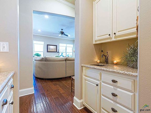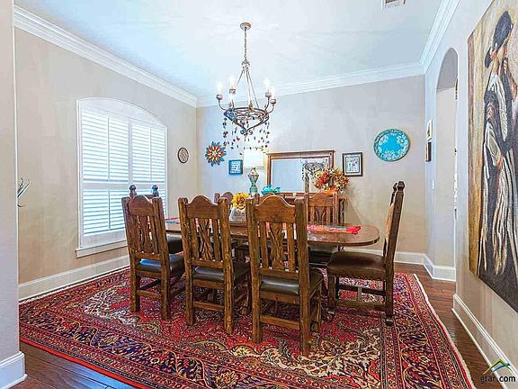 Beautiful 4 Bedroom 3 Bath Custom Home in Cambridge Bend. Traditional home with artistic flair & open floor plan in the middle of South Tyler conveniences. Colorful front door leads to entry hall & formal dining space with butler's pantry. 4th guest bedroom doubles as study, also off entry. Spacious main living area has handsome built-in cabinets flanking the stone accented fireplace. Handsome wood floors ground the space; graceful arches are seen in doorways, custom mill work & cabinetry. Entertaining family & friends will be a pleasure from the open kitchen, living & both dining areas. Efficient kitchen has work island, stainless double ovens, gas cook top, microwave, breakfast bar with lots of counter & storage space! Private Master suite is split from other bedrooms for privacy. Master bath has spa like jetted tub, tiled shower, separate vanities & large walk-in closet. Master bedroom is generous in size & over looks private back yard. Two guest bedrooms are opposite living area & share a Jack & Jill style bath. Covered rear patio has built-in grill and small fridge, hardscape was extended for more entertaining space. Privacy fenced yard with lovely landscaping has plenty of room for pets & "Littles" to enjoy. Community pool is available for residents use with optional additional HOA fees, but are not mandatory. Rice/Hubbard/RE Lee Tyler ISD schools. Updates: Roof 2018, Paint 2017 & 2018, Recessed lights 2017, Removed 2 sets French doors, added large fixed windows 2017, enlarged breakfast area by approx 50 sqft. Sidewalks for safer evening or morning walks and great location make this one to see before you make your decision for your next home! Call now for your private showing!