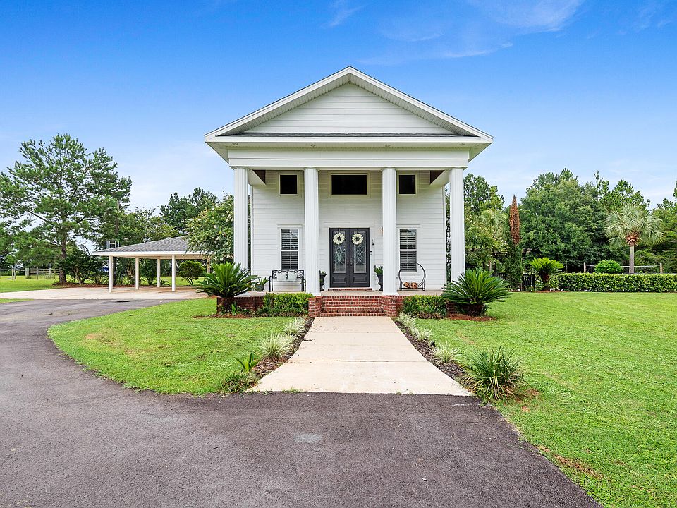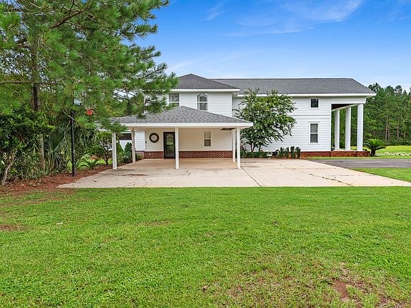 This beautiful, custom built home is situated on a large 7.3-acre lot with privacy. Wake up to the serene sight of deer grazing in your yard, surrounded by native landscaping featuring beautiful azaleas around the perimeter. You'll have the perfect spot for gardening. Enjoy evenings out by the pool under the pergola. The property offers peace & tranquility & it's conveniently located just 45 minutes away from the beach & Pensacola. Inside, there are 4 bedrooms & 3.5 baths & most of the bedrooms feature charming shiplap walls. As you walk in, you'll immediately notice the oversized staircase & fireplace as focal points in the living room. Additionally, there is a 2-acre fenced pasture with water, perfect for any livestock or horses.