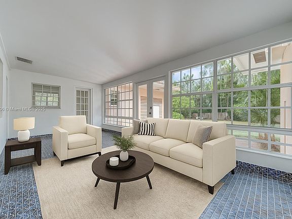 Charming residence located in prestigious Italian Village offers perfect blend of comfort and tranquility. Open porch leads to bright marble floor foyer, large living room, and formal dining room with Cuban tile. This property offers 3 Spacious, split, en-suite bedrooms with updated bathrooms plus powder room. Eat in kitchen leads to sunny family room with French doors leading to the paved courtyard and large lush back yard with fruit trees ideal for outdoor living and entertainment. Other features are a 1 car garage plus workshop/storage area. Near Merrick Park, restaurants, UM, Miracle Mile and Riviera Country Club. With it's private walled lot and comfortable living spaces, this home is an ideal choice for those seeking a peaceful and stylish lifestyle. Some photos virtually staged.