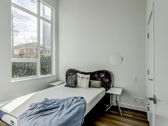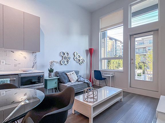 Discover the uniqueness of this one-of-a-kind, high-ceiling (12 ft) 1-bed home at Port&Mill in West Coquitlam. This airy and bright residence features extra windows that invite abundant natural light into the living and bedroom areas. Enjoy the convenience of direct street access—perfect for pet owners and families with strollers. The expansive ground-floor patio offers over 300 sqft of outdoor space for relaxation. Stay comfortable year-round with built-in air conditioning. Just a 6-min walk to Burquitlam Station, with parks, sports fields, and more facilities within 20 minutes walking distance. A rare find in the complex, this home blends style, comfort, and practicality in a prime location!