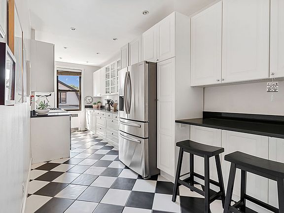 Upon entry, a cozy foyer with a convenient coat closet leads to a spacious dining room, which flows seamlessly into both the beautifully renovated windowed kitchen and a gracious living room. The updated kitchen balances classic design with modern touches, featuring an abundance of cabinetry—both solid white and glass-fronted—along with stainless steel appliances, sleek black quartz countertops, and a double sink with a pull-down spray faucet. The retro black-and-white ceramic tile floor offers a fresh take on the pre-war aesthetic. Expansive countertops provide ample workspace, while a versatile niche serves as a breakfast bar, home office, or whatever suits your needs.