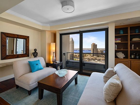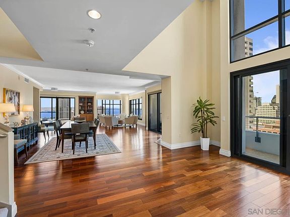 Elevated living on the 20th and 21st floors with almost 4,000 SF of panoramic and unobstructed northwest views. Flooded with natural light through walls of telescopic windows, showcasing spectacular views of the bay, ocean and city to Point Loma, and past Coronado. SW corner unit boasts 3 huge bedrooms plus office surrounded by glass walls, 2 stories, 4 balconies, 2 fire places, 2 side-by-side parking, and 2 storage units. Renaissance will soon have a brand new “street level” lobby and new resort style amenities as seen in the Virtual Tour. Upon entering the first level, you are welcomed by cathedral ceilings that enhance the light-filled, open layout. Gorgeous maple hardwood floors flow throughout the living area, complemented by telescopic windows that fully open, inviting the soothing ocean breeze inside. The family room, featuring eastern views, opens to the kitchen equipped with an island, an under counter wine cooler, ample storage, and a walk-in pantry. Enjoy three walk-out balconies on this level: two offering eastern views and one facing west for stunning sunsets. Two fireplaces enhance the ambiance: one in the living area on the first level and another in the primary bedroom suite. A large guest suite provides unobstructed panoramic water and city views, complete with custom shutters for adjustable light control and includes a walk-in closet and an ensuite bathroom with a multi-jet shower. A powder room convenient for your guests. Located on the second level, bedroom 2 features a spacious layout, a gigantic walk-in closet, and a walk-in shower with custom lighting. The expansive primary suite spans boasts nearly 900 square feet and includes crown molding throughout. The fireplace creates a cozy atmosphere, complemented by a comfortable sitting area by the window. Enjoy a luxurious Jacuzzi tub, dual sinks, and a multi-shower fixture in the primary ensuite catering to your every need. A large west-facing balcony off the primary bedroom offers beautiful sunset views while ensuring privacy. Adjacent to the primary suite is a large office with stunning north and west views through walls of glass, showcasing sparkling water and city lights, along with enhanced privacy. A spacious and private balcony directly off the primary suite offers uninterrupted water views, perfect for romantic evenings or enjoying a good book while watching boats, yachts, and the cityscape extending to the mountains.Two side-by-side parking spaces and two storage areas—one large cage and a temperature-controlled storage room for valuable items like artwork. Renaissance will soon have a brand new “street level” lobby and new resort style amenities including a large landscaped courtyard w/ BBQ aren, 3 fire pits w/ a dining area, pool/spa, gym, community lounge w/ full kitchen, conference room, surveillance throughout the community & 24/7 desk attendants. Ground floor retail conveniently includes Postal Annex for easy Amazon returns, Discount Nutrition & Vitality Juice, Rolling Out Bakery, Vases Salon, iTan and Wells Fargo. Located across from Ralph’s 24 hr. grocery w/ cafes on every corner, steps to the waterfront and Little Italy & just minutes to airport & public transportation and a ferry ride to Coronado. Welcome to paradise!