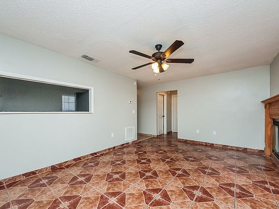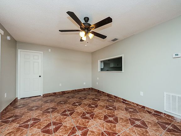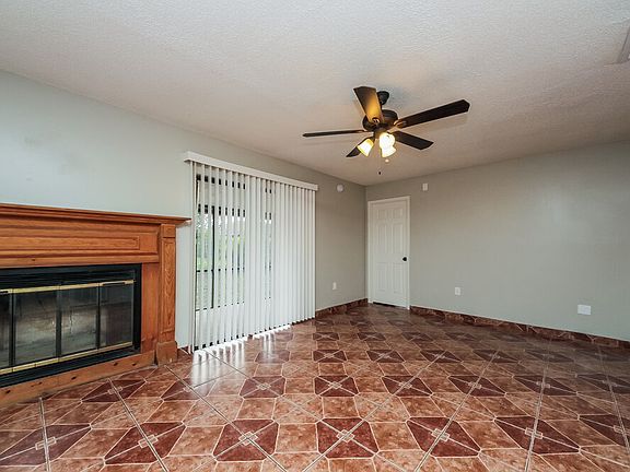 Enjoy great outdoor spaces when you choose this three-bedroom and two-bathroom Kissimmee, FL rental home with a fenced backyard, a Florida sunroom, and a screened-in front porch. The 1,468-square-foot layout starts with colorful tile flooring leading to a cozy fireplace with a mantel in the living room. A ceiling fan will keep you comfortable all year. There's a convenient pass-through window leading into the kitchen, where you'll find all-white cabinetry, stainless steel appliances, and a handy double-basin sink. Access the sunroom out back via a set of sliding glass doors in the primary suite. Along with a large walk-in closet, the suite includes a white tile shower and updated fixtures in the private bathroom. Come take your tour as soon as possible!