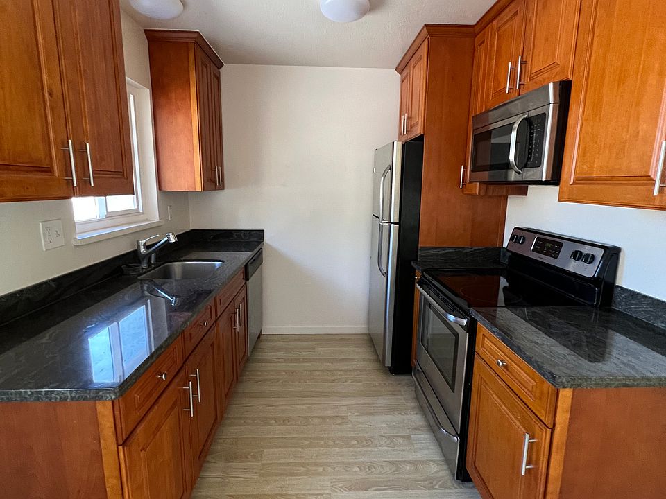 Beautiful Large, SUNNY, NEW REMODEL, Two Bedroom apartment in a home like environment with only 4 other units occupied by lovey tenants. It has new HARD WOOD FLOORS, NEW All Stainless Kitchen. Built-in Microwave, Dishwasher, Garbage Disposal, Large Deck, Laundry in Building, and covered parking.
