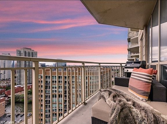 645 Kingsbury is at the intersection of where urban cool meets relaxed neighborhood vibes. From the moment you step out of the elevator to the lobby, you are greeted by friendly 24 hour door staff as you step outside your door to a lushly landscaped island entry with a serene fountain, steps to the rolling hills of Montgomery Park. In the park, you are greeted by picnics amongst neighbors and friends, runners pacing through the park heading to the riverwalk, the laughter at the playground, or giddy dogs making their way to the dog run. This location is like no other. You are surrounded by this vibrant yet quiet neighborhood but then once you step inside your home in the sky you are reminded that you are at the center of the city with access to the best restaurants, shopping, culture, and parks in the world. In the condo, you feel like a King or Queen overlooking the entire city with views of the river, lake, and spectacular skyscrapers with their twinkling lights from your floor to ceiling windows. On your private balcony, you can cozy up under the stars or grill up some mean tailgate food for a Bears game watch party. Your kitchen is equipped for ample entertaining with quality stainless steel appliances, granite counters, lots of cabinet space, and a flowing floor plan. Who wouldn't be inspired to be the next food network star with these gorgeous views from your kitchen? In this 1250 sq ft. corner unit you even have enough room to entertain at your dining table or create multiple at-home work offices. There's no need to leave the building to take any conference calls which can be done in the community room or get your work out in at the fully equipped gym. After a long day at work, you can relax in your gorgeous master suite. The spa-like bathroom features a full tub for bubble baths, separate walk-in shower, and dual vanities. The closet space will be the envy of any fashionista with dual rows of closets as you exit the bathroom into the bedroom and when you finally lay your head down at night you can count also those magical city lights instead of sheep.