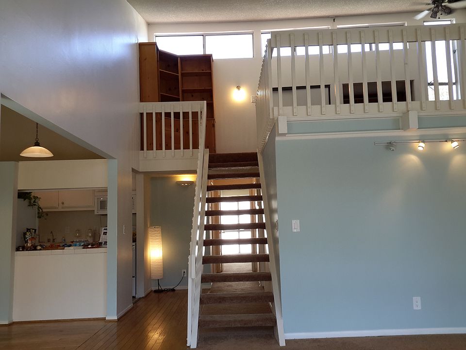 - Balcony, Living Room Deck Attached, Open Floorplan, Cathedral Ceiling(s), Ceiling Fan(s), Storage