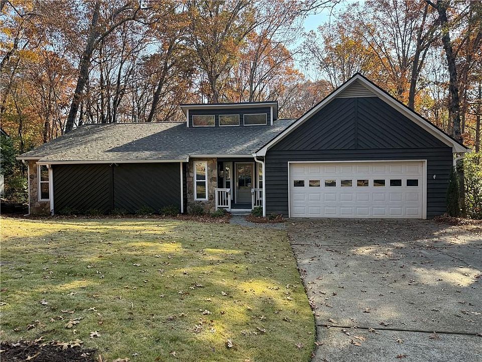 Don't miss this extraordinary renovation where every detail has been meticulously crafted! Situated on a coveted cul-de-sac lot, this home offers a flat front yard and driveway, complemented by fresh exterior paint, new windows, new gutters, and newly installed professional landscaping. The expansive two-tier deck on the back provides a stunning wooded view, perfect for outdoor enjoyment or entertaining. Inside, you'll find gorgeous new hardwood floors, vaulted beamed ceilings, and an abundance of natural light. The open floor plan is also ideal for entertaining. The main level features an all-new kitchen and newly renovated bathrooms along with a coveted primary bedroom on the mail level. The kitchen boasts quartz countertops, stainless steel appliances, and a large island great for gathering with family or entertaining. The expansive daylight basement with high ceilings includes two additional bedrooms, a bathroom, and a huge flex room perfect for your man cave or extra living space. Enjoy the convenience of a brand-new water heater and a brand new zoned HVAC system and brand new roof. The interior also features new lighting throughout, new flooring throughout, and new paint throughout. Too many features to list! Located in highly desirable Martins Landing in the heart of Roswell, you'll have access to swimming, tennis, lakes, trails, and much more. This home is truly a standout!