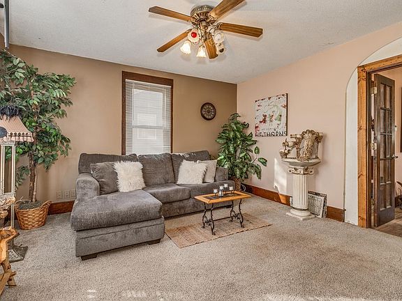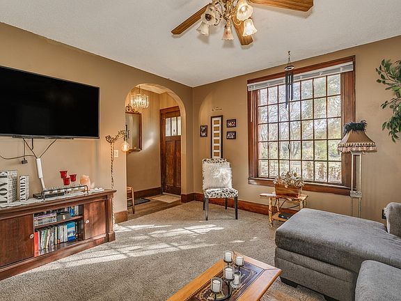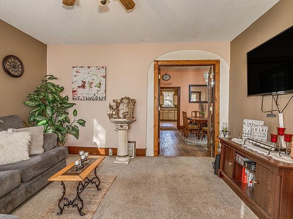 This charming 2 bedroom 1 bath, 1-car garage on a private 0.17 acre lot located on a quiet, tranquil street across the street from Rush City Park gives a Tuscan Chalet vibe. The home has received many updates and lots of love & care over the years including fresh paint, steel siding, newer windows, newer sliding glass door & updated bath & kitchen. The house has super tall ceilings, beautiful original hardwood floors & woodwork, tin kitchen ceiling tiles, French doors, built-in wine rack, a sunroom/porch, deck & a unique walk through primary closet. The large yard is full of flowering perennials, gorgeous maple trees, grapes, raspberries, mostly fenced, privacy, & a firepit. Currently, the 1 car garage is being used as an outdoor bar and recreation area, but can easily be used as a garage again. EZ commute to the T.C. Make your appointment to tour this beauty today!