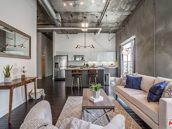 Stunning residence at Market Lofts. This southwest corner, statuesque penthouse boasts a large, open floorplan with soaring ceilings (exclusive to the penthouse level), hardwood floors and exposed concrete walls, posts and ceilings. Lined with huge windows, views of Grand Hope Park to the Downtown skyline, including Wilshire Grand Tower, can be seen from about every corner of this home. The modern kitchen with European cabinetry, stainless steel appliances and quartz countertops. Each bedroom comes well-appointed; one is completely private while the other is open, but easily convertible for complete privacy. The en-suite master bathroom is large and spacious, and the residence comes complete with in-unit washer and dryer and two side-by-side parking spaces. Amenities include a pool, spa, gym, media room and 24-hour security. At the center of South Park, atop Ralphs and blocks from Whole Foods and upcoming Apple and Erewhon stores.
