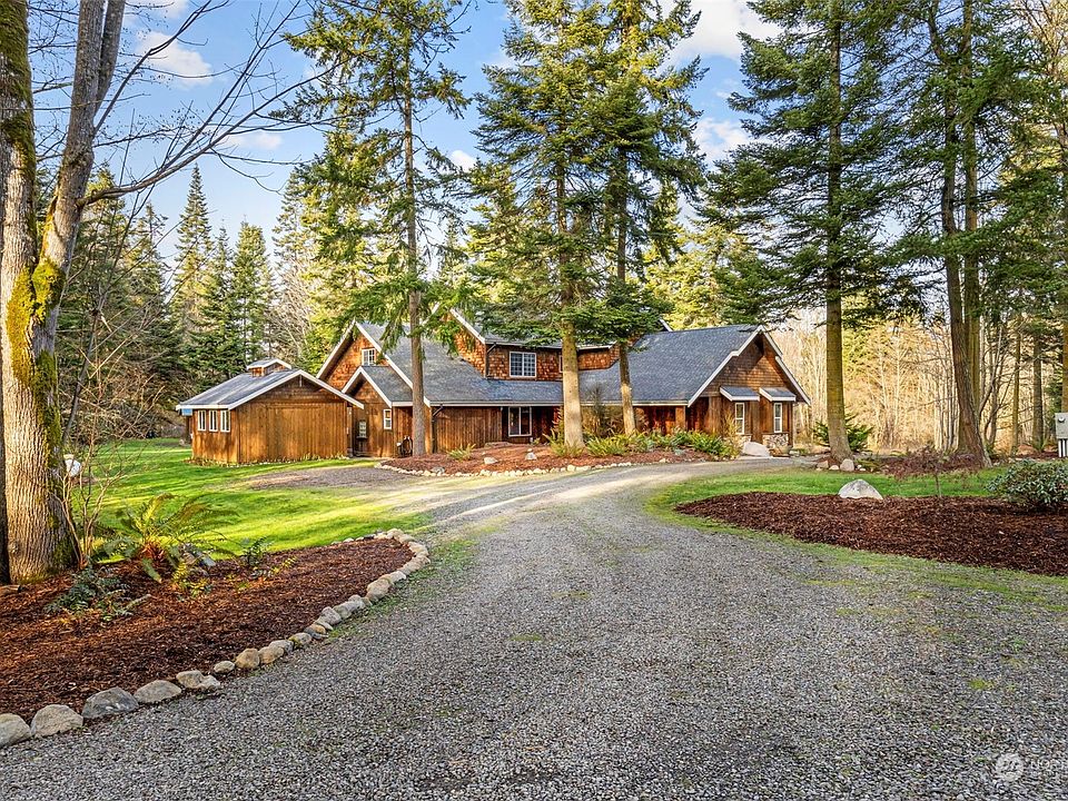 This beautifully crafted custom home sits on over 4 acres of what can only be called a pristine, park-like setting! Offering the utmost in privacy, w/ a tranquil living experience! The attention to design detail is visible from the moment you step inside: wood finishes (all milled from the property) & chef’s kitchen featuring stainless appliances & concrete countertops that leads into the vaulted great room w/river rock fireplace. Primary suite incl. spa-like stone shower. Upgrades incl: new hot water heater & boiler, new radiant floor heating system, new wood flooring, 15x15 outbuilding perfect for office, art studio or workshop. Attached garage + separate large shop near the picturesque pond. New fiber internet was brought in by Seller.