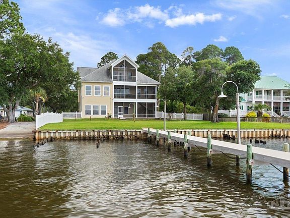 Private Boat Ramp, 1.3 acres, Elevator, Dock, Lift, No HOA, 120 feet or shoreline- This 4,080 sq ft waterfront home has it all. 5 bedrooms, 3 full bathrooms, and versatility for multi-generational living or income potential. A rare private on-site boat launch and flow-through dock with boat lift make jet skiing, boating, and waterfront fun effortless. The dock also features a covered entertainment space with electricity, water-misting, plumbing, and security cameras—perfect for cleaning fish or sunset gatherings. Designed for comfort and accessibility, the home includes an elevator servicing all three levels. The lower level functions as its own living quarters with 2 bedrooms, a full bath, a kitchen, and living area, making it ideal for guests, rental income or in-laws. The middle level encompasses 2 more bedrooms, a full bath and a versatile entertaining space with an open concept design. The bright kitchen boasts gourmet appliances and spacious granite counter tops. A generous island with seating for six ensures the chef stays at the heart of every gathering. A modern, elegant fireplace anchors the living room, creating a warm and inviting space—yet the expansive views of East Bay, visible across the entire back of the home, remain the true focal point. The top-floor Owners suite is a true sanctuary, offering views of both the private estate and the bay. Enjoy three stories of screened porches that stretch across the rear of the home—ideal for dining al fresco, morning coffee, or simply watching dolphins at play. Outdoors, you’ll find the beautifully maintained grounds with plenty of space for a pool. The home sits directly on the paved multi-use path that connects Gulf Breeze and Navarre—perfect for stroller walks, jogging, biking, and golf cart rides. This property in the well maintained community of Lagniappe Beach has no HOA. Whether you're enjoying nature, or launching onto the water, this rare gem delivers the ultimate in waterfront living.
