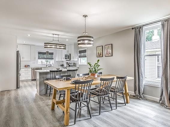 Once inside you're greeted by a bright entry room with storage. Next you'll find an open living and dining room that leads to a spacious, remodeled kitchen with stainless-steel GE appliances, white cabinets, and granite countertops. A large center island with seating makes entertaining easy.