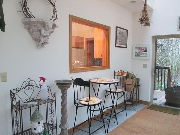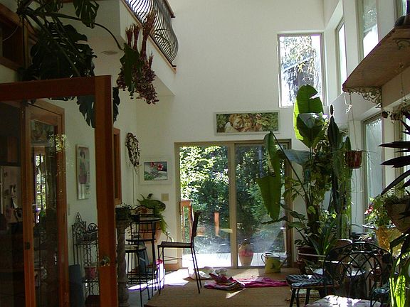 This home is elegant and modern, well appointed with fine furniture and beautiful art. Large windows look out upon forest views. Radiant floor heats the solarium and circulates throughout the house.