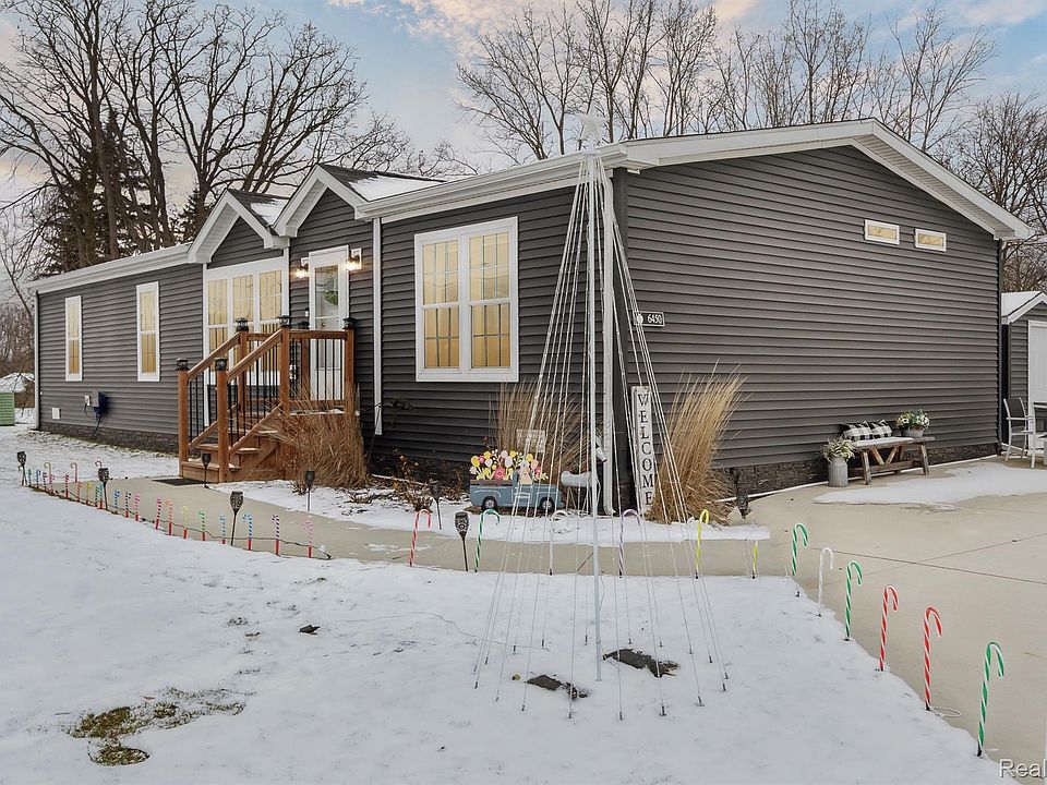 This stunning "Magnolia Home in Fenton represents the perfect blend of luxury, comfort, and thoughtful design. Immaculately maintained and expertly upgraded, this manufactured home is a rare gem, offering nearly 1,600 square feet of meticulously planned living space. Nestled on the largest corner lot in the community, this property offers both privacy and an inviting sense of space, making it a true standout.From the moment you step inside, you are greeted by an open-concept layout bathed in natural light pouring through beautiful Muntin windows. The living area accommodates family life and entertaining alike. Anchoring the home’s heart is a charming fireplace in the dining area, creating a cozy and elegant atmosphere for meals.The master suite is a sanctuary of comfort and luxury, featuring a spa-like bathroom with dual sinks, an oversized walk-in shower, and a spacious walk-in closet. Situated at the opposite end of the home, two additional bedrooms provide ample space for family or guests. A built-in office space enhances the home’s functionality. Outside, the property truly shines as a private retreat. The spacious concrete pad is perfect for outdoor living, whether enjoying a quiet evening under the gazebo or hosting lively barbecues with friends. With no neighbors directly behind or to the side of the property, the outdoor space feels secluded and serene. The parking area accommodates up to six vehicles and has been approved for a future garage build. The community boasts resort style living featuring a private clubhouse, a heated swimming pool with a splash pad, playground, basketball court, and a host of organized activities. A strict resident approval process ensures the neighborhood retains its high standard of quality, creating a secure and welcoming environment. The home’s current owner has gone above and beyond, upgrading every detail to elevate it beyond its original design. With impeccable finishes, and drywall interior, this property offers a turnkey living experience that rivals new construction.