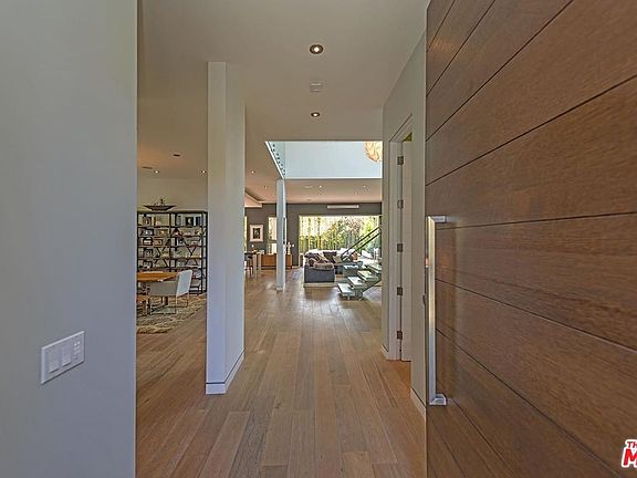 This modern architectural is beautifully detailed with professionally landscaped & gated grounds, outdoor kitchen/dining pavilion, custom window & wall treatments, dining room courtyard water-wall, and built-in sound system. Main floor offers large-scale spaces perfect for entertaining with expansive walls of glass opening to loggia and resort-like outdoor living. Wide-plank wood flooring throughout. Chef's kitchen with sleek Italian cabinetry, high-end Miele appliances, over-sized island & informal built-in dining table. Infinity-edge pool/spa surrounded by rich wood decking. Private first floor office/guest suite. Dramatic glass-railed floating stairs lead to upper level with a spectacular light-filled master suite with walk-in closet, spa-like bath, & large south-facing terrace overlooking the pool. Two additional bedrooms with en suite baths & balconies, an open guest/family lounging room with bath, and a well-designed laundry room complete the second floor.