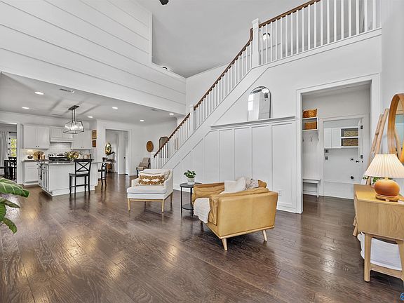 Dining roomLarge flexible bonus roomHome theaterPainted brickLarge quartz countertopsOpen-concept kitchen