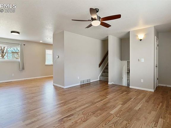 Beautifully maintained 3BR, 2BA tri-level home located in the established Constitution Hills neighborhood. Features 1288 SF of well designed space with ceiling fans, central air and heat for year round comfort. Open main level floor plan, great for entertaining family and friends. Warm hardwood floors throughout the main level. Window coverings and blinds throughout. Storm door Entry into the Living Room which include large windows that invite abundant natural light. The Living Room flows seamlessly into the Dining Room that offers convenient garage access. The light and bright kitchen offers ample wood cabinets and Formica countertops for kitchen storage and easy food preparation. It is equipped with white appliances including a smooth top range oven, vent fan, dishwasher, refrigerator, and counter microwave. The upper level hosts 2BRs with neutral carpet that share a Full Bathroom with vanity, framed medicine cabinet mirror, and a tiled tub/shower. The lower level includes a Family Room with neutral carpet, and a new electric fireplace with stone surround, and a third bedroom with neutral carpet and adjoining Shower Bathroom and laundry area. Attached 1-car garage with door opener, built-in workbench, and service door. The spacious, fenced backyard provides auto sprinklers, a concrete patio for outdoor dining and relaxation, and mature trees for privacy. The side yard is large enough for small RV or boat storage. No HOA. Ideally located walking distance to open space and Horizon Middle school. Enjoy shopping, dining, and entertainment along the Powers Corridor. Easy commute to Peterson Space Force Base and Shriever Air Force Base. Don't miss the opportunity to make this delightful MOVE-IN READY home your own!