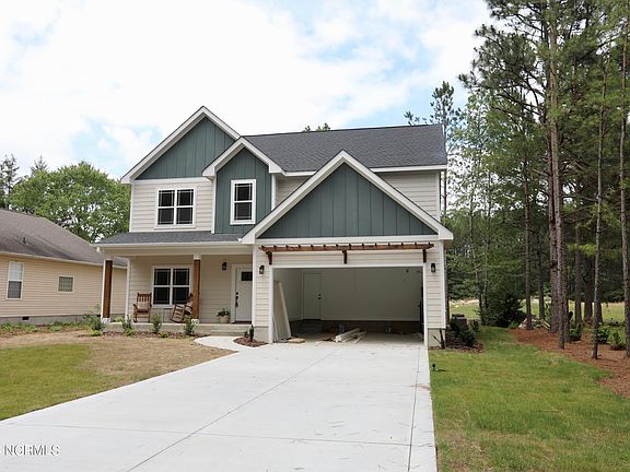 Welcome home to this stunning new build by Wolf Development and Construction! Greeted with a covered rocking chair front porch, you enter into an open floor plan that flows into the dinning room, kitchen, and living room. This gorgeous kitchen is filled with an abundance of light and has Champagne Gold finishes, quartz counters, spacious bar, tiled backsplash and a walk in pantry. There is lots of room to invite family and friends over to enjoy brunch/dinner in the formal dining room. The light filled living room has a gas fireplace and overlooks the Palmer Golf course. Step outside to relax on the covered patio and enjoy the lovely outdoors! Luxury vinyl plank and crown molding is throughout the main living spaces. There is a drop zone near the laundry room. The primary bedroom is downstairs, has 2 closets, and large windows with beautiful views. The ensuite has tiled flooring, quartz counters, double vanity, tiled shower, water closet, and garden tub. This home boasts 2,616 sq ft of living space with 5 bedrooms and 3 1/2 baths plus a large bonus/flex room. Space galore! Bald Eagle is a quiet street with a cul-de-sac at both ends. Nestled in the desirable gated community of Woodlake, you will find unique amenities. Relax by the pool this summer and enjoy refreshments from the snack shack. The kids will never be bored with the playground, basketball and volleyball courts. . Woodlake is near Fort Bragg, Pinehurst, Southern Pines, Sanford and medical facilities. This exquisite home can be yours today!! Photos are representative only. Paint and cabinet colors can vary from pictures.