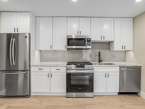 White countersOpen layoutGenerous closetsTile flooringSleek kitchenStainless steel appliances