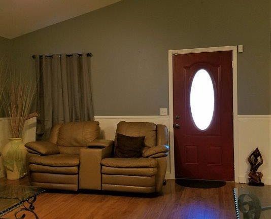 Beautifully updated 3 bedroom, 2 bathroom with vaulted ceiling in the spacious open living room, kitchen, and dining areas. New Berber carpeting in all bedrooms and new laminate wood flooring throughout living area and hallway. Home has a single car carport which could be converted to a garage or 4th bedroom if needed. Large storage building already has interior walls to convert to living area or workshop, with open deck. Additional driveway and parking area on opposite side of lot from the concrete driveway leading to the carport. Central air/heat, city water and septic. Leaving some furniture, decor, and washer/dryer is negotiable. *Exterior photos to be added upon completion of landscape updating.* *3rd bedroom not photographed as it is used for box storage by owner.*