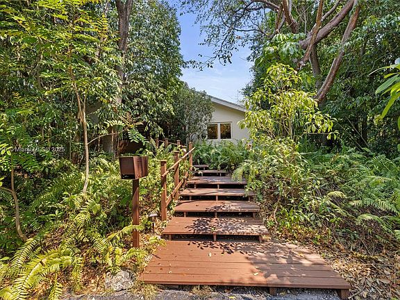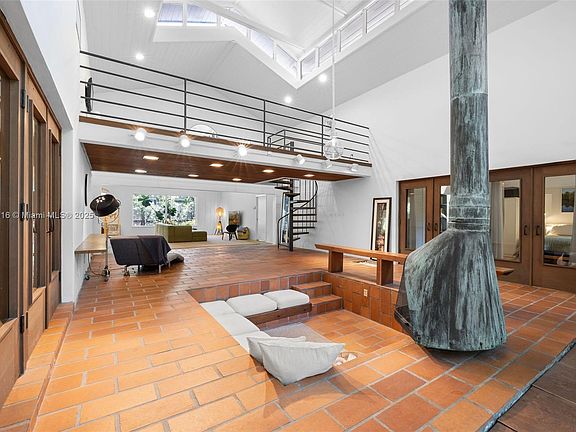 This architecturally unique Tropical Modern home in Pinecrest’s Devonwood neighborhood is perched on a hill in a peaceful, hammock forest-like setting. A clerestory above 20’ vaulted ceilings and window wall allows for abundant natural light. A wood stairway and front entry open to a great room with a modern conversation pit and hanging fireplace with patina finish. A spiral staircase leads to a spacious upper-level open loft with treetop views – perfect for home office. Other areas have high volume 9-10’ ceilings. The split plan layout with 3 bedrooms and 3 full baths offers privacy and functionality. The attached 2-car carport w/ storage converts easily to a garage or addition for a 4th bedroom—plans available. The large lot includes a wonderful garden-surrounded pool & fenced backyard.