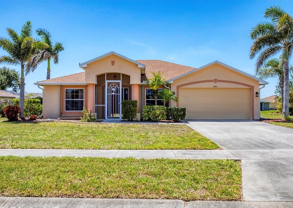 Looking for a 3 bedroom, 2 bath and a TWO CAR GARAGE home in the popular Gardens of Gulf Cove? This spacious block 1,636 under air sq ft home also has a large screen lanai off the living room facing the spacious backyard. You have plenty of room to add a shed, fence, grilling area, firepit or private pool if desired. As you enter the front screened entrance, you walk into the dining / additional sitting room which would make for a perfect office space. The kitchen and living room open out to the lanai by sliding glass doors allowing for a great view of the backyard. The kitchen has a large pantry and long breakfast bar countertop. BRAND NEW Stainless Steel Refrigerator, Oven, Dishwasher and Microwave. The laundry room is off the kitchen and also serves as the garage entrance into the home. The primary suite is on the right side of the living room and the guest bedrooms and bath are on the left side providing extra privacy as a split floorplan. The primary bathroom has dual sinks, a soaking tub plus a shower. This home has lots of closets! The primary bedroom has a large walk-in closet, the hallway into the living room has a large storage closet plus there is a linen closet near the guest bathroom. The big ticket items are all new! 2022 Roof - 2021 AC - 2024 Electric Panel - 2018 Accordion Shutters that easily close and lock. There is also a convenient timed sprinkler lawn system on a well which saves on your water bill. The Gardens of Gulf Cove Community is known for their low annual HOA fees and array of amenities: 2 COMMUNITY POOLS (one heated)! Shuffleboard and Recreation Center by the heated pool makes a great area to bring your friends and family to enjoy mingling with other community members. The other pool is by the Clubhouse where you can join ongoing events (check for the latest calendar of events on the website). Tennis / pickleball and basketball courts are located between the two pools. Plenty of sidewalks for evening walks with the dog. There is even a new doggy day care center within close proximity. Plus it's a great community to enjoy a bicycle ride and view the many lakes. Need extra storage? There is additional fenced property where owners may store boats and trailers. Love golfing? Take a short drive to the many golf courses in Englewood. Prefer boating and fishing? Take a car ride to Boca Grande or the Englewood Beaches. Call today for a private showing!