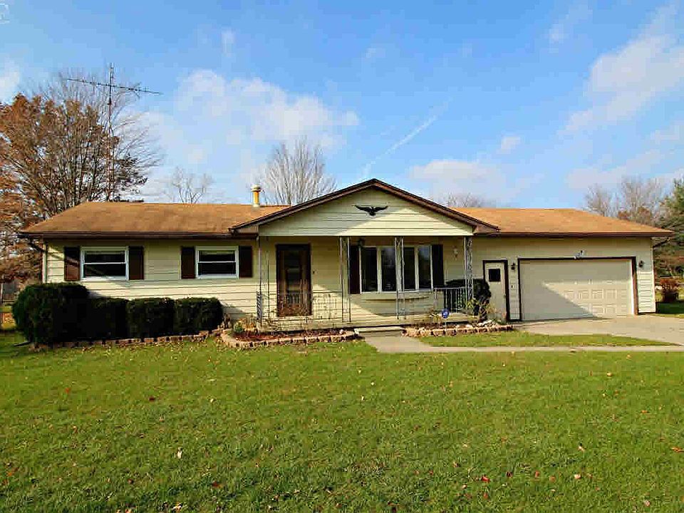 Nearly an acre in the country surrounds this one owner ranch home. Master suite with private 1/2 bath. Newer vinyl windows. Fenced yard. Deck plus covered front porch. Over-sized 2 car garage a plus. Includes all appliances. Great lower level with finishing possibilities. City water available at the street. Exclude:Alarm
