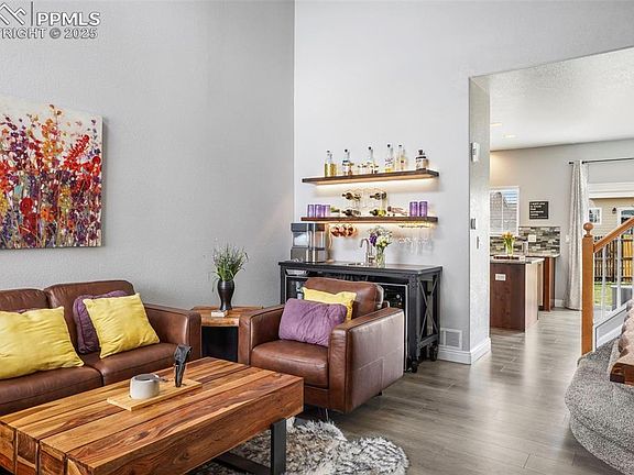 A Rare Gem in Ridgeview at Stetson Hills – Over 3,000 Sq Ft of Impeccable Living Tucked into the heart of the Powers Corridor, this beautifully updated home offers over 3,000 sq ft of refined comfort, combining timeless design with smart, intentional upgrades throughout. The interior welcomes with a calm, neutral palette that feels elevated and warm, enhanced by updated lighting, a hardwired sound system, and custom window treatments throughout. The main level feels expansive yet grounded, filled with rich natural textures and anchored by a show-stopping fireplace and mantle. A sleek wet bar with dual drink fridges adds effortless function and flair, perfect for hosting or unwinding in style. The kitchen is both beautiful and practical, featuring granite countertops, new cabinetry, and natural finishes that invite connection. A separate dining area offers flow between gathering spaces and the open-concept living area. The layout includes five bedrooms, including a private main-level suite—ideal for guests, multi-gen living, or a home office. Upstairs, four additional bedrooms and a thoughtfully placed laundry room enhance daily ease and convenience. The unfinished basement offers serious potential, with a built-in workshop and utility sink already in place—perfect for hobbies, projects, or future expansion. Outdoors, enjoy a fully landscaped yard designed for function and fun, featuring a large 34x11 patio, sandbox, raised garden bed, and storage shed—plus an attached two-car garage with ample room for tools and gear. Every detail reflects quality, care, and comfort. From the thoughtful layout to the timeless finishes, this home is designed for everyday ease and lasting impressions. Located near shopping, dining, entertainment, parks, trails, fitness centers, coffee shops, schools, services, and top amenities, this property offers a lifestyle as comfortable as it is convenient. Come experience the light, space, charm, and potential for yourself.