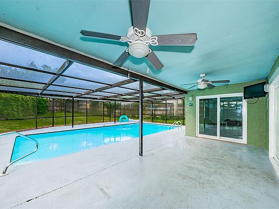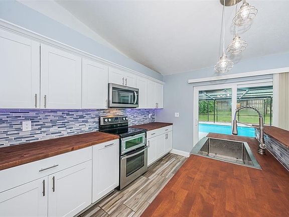 Perfect single-family home in the heart of Spring Hill! This 1849 sq ft open-floor plan provides 3 BD, 2 BA, separate dining space and large family room with built-ins/storage, decorative electric fireplace, and an AMAZING fish tank! Neutral paint color inside and sought-after porcelain tile throughout. NO CARPET! The kitchen has been gutted/remodeled with light cabinets, glass tile details, beautiful butcher block counter tops, a bat wing island perfect for additional seating, farmhouse sink, newer stainless steel appliances and vaulted ceiling with large decorative beam. Newer windows and doors 2018, and a great view of the POOL from the kitchen. LARGE chlorine pool, screened-in with a covered section to relax in the shade. Solar panels to heat the pool. Already fenced for your privacy! Guest room has a private door to the pool area. Master bedroom has its own lanai door and has been updated to include barn doors. The master ensuite offer a large tiled walk in STEAM shower, dual sinks, large walk-in closet and a modern soaker tub. Inside utility room with sink. SO much POTENTIAL in this gem! Electrical updated, AC 2019, water heater 2020. All appliances and TV's stay. Large spacious driveway. Brand new landscaping. Full irrigation. This lot is 0.31 acres and is situated on a corner. NO sinkhole, No HOA/CDD. Public utilities, septic. Near medical, grocery, shopping and the Veterans Expressway.