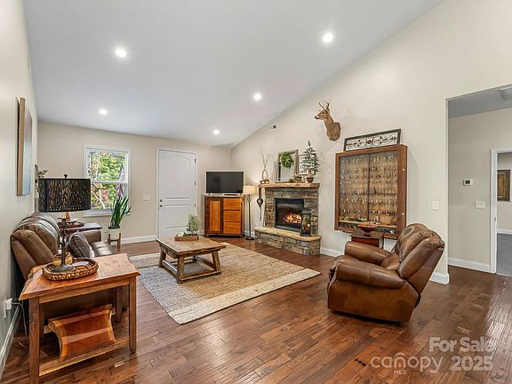 This well-built three-bedroom, two-and-a-half-bath home sits on 22.96 acres that adjoin over 13,519 acres of North Carolina Game Lands, South Mountain State Park, and US Forest Service land, offering unparalleled opportunities to hunt, hike, and camp on your own property or government lands; trail camera photos document monster bucks, bears, and turkeys, making this a paradise for nature lovers and outdoor enthusiasts. The home features an open living concept with high ceilings, two large suite bedrooms with full bathrooms and walk-in closets, and a smaller bedroom near the living room and kitchen; the living room showcases a gas log fireplace, and the kitchen boasts beautiful granite countertops with two sinks in the bar area and ample cabinet storage. Throughout the home are 4" hickory hardwood flooring (Summer Harvest Viking Grade) in rustic style, with ceramic tile in the rest of the home. Outside, the property is secluded with numerous private retreats, including a fire pit and a back covered porch overlooking the mountains. A detached 2-bay garage (30' X 50') with 2 windows and a (14 X 50) lean-to that accommodates a regular bass boat and a large Pontoon, with additional space serving as a workshop and extra storage. There is also an additional on-site home currently used for storage—a three-bedroom, one-bath with a basement, its own well, and 1.15 deeded acres. The copper plumbing and some wiring were removed from this home years ago, when it was vacant. This property is a must-see for outdoor enthusiasts seeking expansive land, versatile living spaces, and abundant recreational potential.