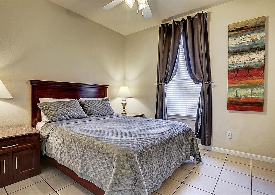 upstairs unit. new paint. totally furnished. can be short term or long term. Owner offers one queen bed with mattress in bedroom #1; two twin beds with mattresses and one desk in bedroom#2. Sofa bed in the living room. High bench for eating bar. Granite Countertop. All Tiled. Free use washer and dryer in laundry room. Bus line. In the center of Houston International Food district and banking district. walk to everything, grocery stores, restaurants, doctor's office, post office... Minutes to all highways, I 59, Beltway 8, 290, I 10, Westheimer Rd., Westpark Expressway. Gated 7/24 code entry. Surveillance cameras thru out the whole common area.