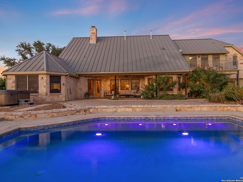 Seller will contribute $17,000 toward buyer's closing costs with an acceptable offer. Priced to move with flexible terms-bring your offer. On 28+ ag-exempt acres in gated Spring Creek Estates, this 2004 stone ranch (~3,182 SF) delivers true Hill Country living minutes to Fredericksburg and the 290 Wine Trail. Live easy: 4BD/3BA, airy great room with big-view windows, doors to a sparkling pool + patio, and a granite-island kitchen (double ovens, gas cooktop). Split primary suite with spa bath and walk-in closet; upstairs addition/4th BR for media, gym, or office. Serious utility: private water well, fully fenced & cross-fenced pastures, and a 4060 insulated workshop/barn with RV/boat bay-motor-coach friendly door & overhang-plus dedicated RV hookups (power + in-wall sewer) so you can park and stay fully connected under cover. Separate 1BD/1BA guest apartment for multigenerational living, caretaker, or income. Horses welcome. Ag valuation helps keep holding costs low. Per owner/HOA guidelines, on-property hunting is permitted-axis, whitetail, and wild turkey are commonly seen (buyer to verify CCRs/HOA).
