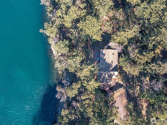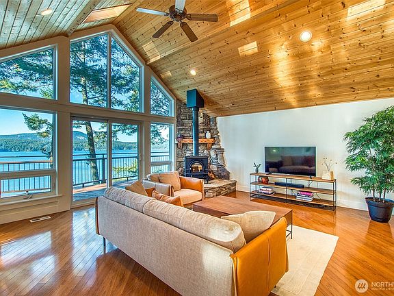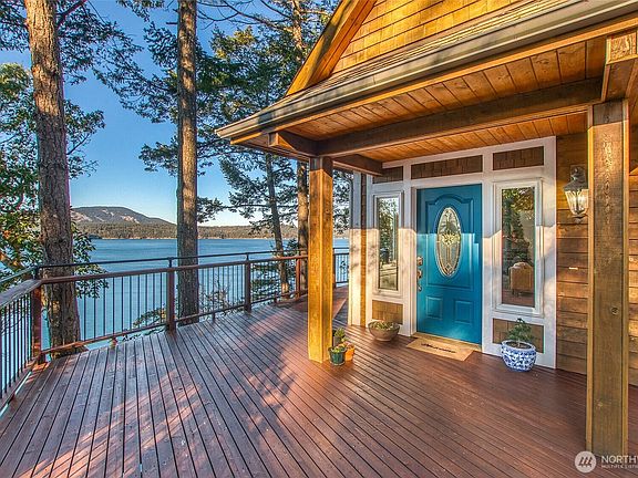 Experience stunning west-facing views across East Sound, framing iconic Turtleback Mtn & offering a front-row seat to spectacular sunsets & the occasional whale sighting. 3 bdr 2.5bath well-maintained NW Contemporary hm embraces its waterfront setting w/ an open concept great room w/ tall ceilings & expansive water views. Hardwood floors add warmth & elegance. Spacious primary features an en-suite bath w/ jetted tub & sauna—an ideal retreat after a day of exploring nearby Moran Park's hiking trails. 2 guest bdrms on lower level offer privacy & continued water views. Wraparound decks accessible from all bdrms. Lrg bonus rm downstairs provides endless possibilities. Low maintenance landscaping. Conveniently close to town & Rosario seaplane.