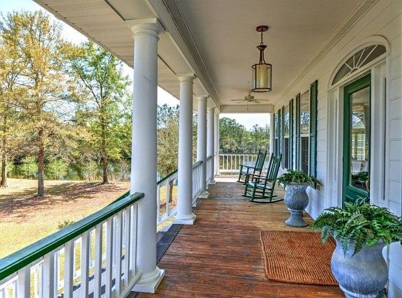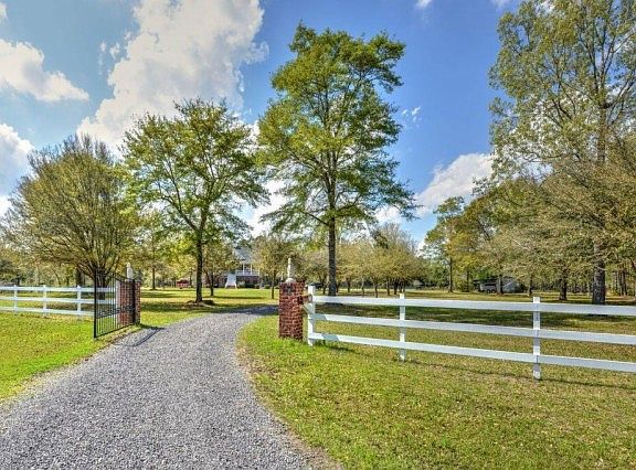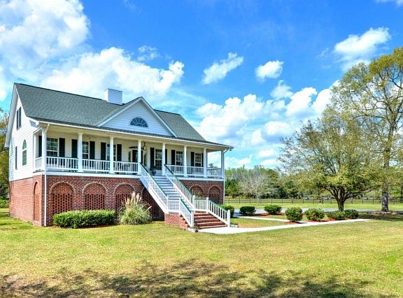 The name says it all, Scarlett's Retreat. Located just 30 minutes south of Historic Charleston SC, this home situated on over 7 acres is a welcome respite from the daily hustle and bustle of life. Enjoy the privacy of your own oasis only minutes from the culture and lifestyle people love about Downtown Charleston. The stately brick staircase invites you to the widefront porch, sit and relax and enjoy the peaceful pasture and pond views. Inside you will be wowed by the heart pine flooring throughout the house, solid wood counter tops in the kitchen, and unique Australian Cypress flooring in the sun room.Tall ceilings,lots of windows,a ground floor media room, panoramic views from every room, pastures for your horses, a fishing dock for a fisherman or maybe just a tan. Chandelier in dining The back part of this 7 acre lot has been perked. A one time subdivision should be possible, buyers would need to gather any restrictions on size and conditions that need to be met.