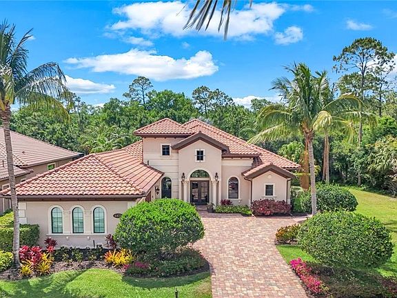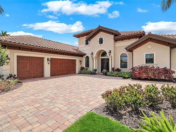 6477 Costa Circle embodies a level of refinement rarely found in Lely Resort. Set within the exclusive enclave of Lakoya, this custom Greenbriar II by Stock Signature Homes pairs architectural integrity with a curated aesthetic that elevates every room. A hand-forged Cantera iron door opens to interiors defined by thoughtful craftsmanship—24-inch diagonal stone flooring, tailored millwork, and a luminous flow of natural light. The kitchen serves as both a functional workspace and a work of art, showcasing stacked illuminated cabinetry, a walnut butcher-block island, hand-painted Tabarka tile, a Viking gas cooktop, Monogram appliances, and a California Closets pantry designed for effortless organization. Sophisticated detailing continues throughout: an antique-mirror feature wall in the dining room, living-room beams with integrated LED lighting, and a bespoke pool bath finished with artisanal tilework. The primary suite stands apart as a serene retreat, enriched with Venetian plaster walls in the bath and dual closets by California Closets. Beyond the glass, more than 2,400 square feet of lanai space creates an exceptionally private sanctuary. A rectilinear saltwater pool and spa anchor the outdoor living experience, surrounded by mature tropical landscaping and the luxury of true western exposure for nightly sunsets. The 710-square-foot covered area is finished with a cypress ceiling, custom cabinetry, wet bar, sink, refrigerator, and a built-in TV—an outdoor living room designed for year-round enjoyment. Additional features include solid-core doors, impact-resistant windows and doors, hot-water recirculation, custom lighting, upgraded window treatments, and a finished garage with workbench. The result is a residence that feels bespoke at every turn. Within minutes of downtown Naples and the Gulf, and complemented by world-class golf, tennis, spa, and dining amenities, this home speaks to the buyer who values craftsmanship, privacy, and a sophisticated resort lifestyle.