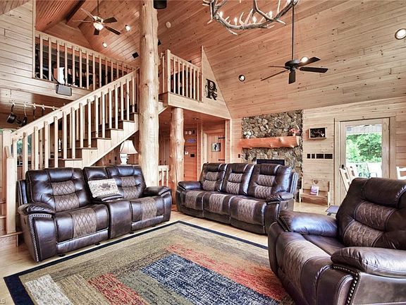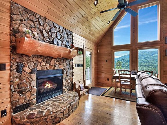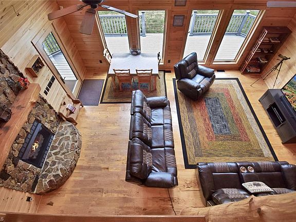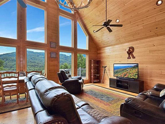 This A-frame cabin sits on 39.5+/- acres, offering space & freedom. Gated Entrance awaits greeted by vaulted ceilings & impressive rock gas fireplace, adding warmth and character. Large Primary suite leads to the deck. The loft area is perfect for a home office or creative haven, with inspiring views to catalyze your productivity. Each corner of this property boasts of natural light & views of the surrounding mountains. The kitchen features beautiful wood cabinets, stainless steel appliances, granite countertops and a double oven. Downstairs leads to a bedroom, half bath, kitchenette, Rec room, & a climate-controlled safe room. 4 fenced pastures with water access, 2 spring fed ponds stocked with fish. 32x50 barn with power, stalls, and water. Concrete pad for RV hookup with power. Gambill Creek Ranch is unique yet close to attractions, State Parks, Golf Courses, Game lands, & wineries. No restrictions so bring your animals. Perfect for AirBnB short term rentals. 1yr AHS Home Warranty