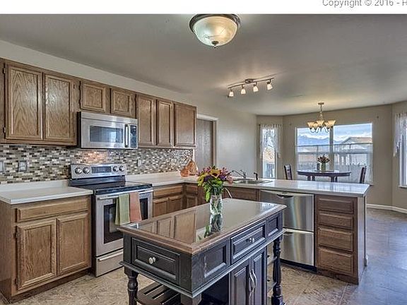 Spacious two story home with 4 bedrooms, 4 bathrooms and an attached 2 car garage. This home features a main level master suite with a 5 piece master bathroom, jetted tub and walk in closet. Updated kitchen with breakfast nook, formal separate dining room, formal living room, powder room and family room with a gas fireplace. Also on the main level is a laundry room, garage entrance and walk out to large fenced in back yard with full on Mountain views! Upstairs there are 3 generous sized bedrooms plus a loft space. This home has a well thought out layout and plenty of space. The entrance has a covered porch and you walk in to a grand looking stair case. There are laminate floors throughout the main level. The kitchen has been updated to include reclaimed wood on an accent wall and on the island to create character and charm. There are all stainless steel appliances and a glass tile back splash plus a kitchen pantry. Off of the kitchen is a powder room and a large breakfast nook. This home also has a separate formal dining room to enjoy those family holidays and gatherings. The laundry room is on the main level off of the family room. Upstairs has a linen closet and a full bathroom plus a loft space that could be used as a play area, office or just another TV room. Two of the bedrooms upstairs share a Jack and Jill bathroom. All bedrooms have great closet space as well. Other extras are a shed out in the back yard, a wood deck, 1/4 acre corner lot, children's swing set, chair swing overlooking the breathtaking Mountain views, all window coverings and an upgraded security system. You can't go wrong with the space this home offers! Conveniently located off of the Powers corridor near shopping, restaurants, parks and more. Close to Ft Carson! A must see!