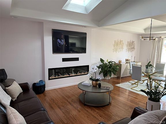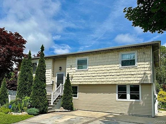 Welcome to this beautifully renovated Hi-Ranch, surrounded by serene and thoughtfully designed landscaping. This move-in-ready home features gleaming hardwood floors, abundant natural light enhanced by multiple skylights, updated bathrooms, and a stunning eat-in kitchen complete with granite countertops, custom cabinetry, and a gas boiler with a hot water heater. The upper level offers an open-concept living and dining area with sliding glass doors leading to a spacious deck—perfect for entertaining. The primary bedroom includes his-and-hers closets, accompanied by two additional bedrooms and an updated full bath. The lower level features a fully permitted accessory apartment, complete with its own living room, two additional bedrooms, a bathroom, a kitchen, a dining area, and a separate laundry/utility room. Additional highlights include in-ground sprinklers, a paved front patio area, a large rear deck, and a detached garage.