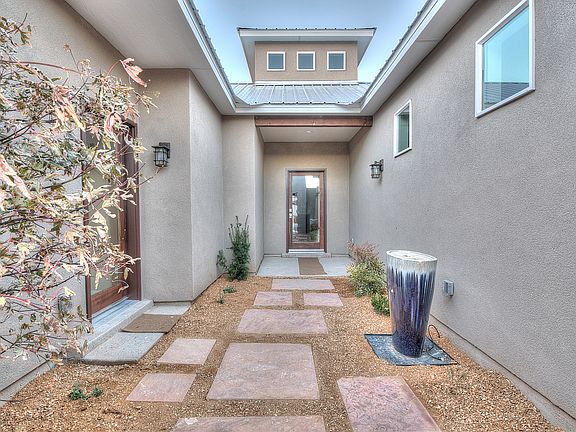 Tucked back in the cottonwoods towards the end of Bicycle Boulevard, this quaint gated community boasts only 18 homes and lush common area landscaping with pergola and picnic table. Built by Las Ventanas Homes, this one level transitional style home boasts a distinctive Casita floor plan with clever interior courtyard. Three years young with three bedrooms and three baths and gorgeous kitchen open to the living room, stainless appliances, beautiful tile floors throughout, wood floors in the master bedroom, built in speakers, huge walk in closet and Ella spa tub with heated tile floor! Covered patio and outside fireplace, low maintenance yard and home backs to acre lots for maximum privacy. NM Green Build Silver certified and just about perfect!!! Separate heat/cool unit in Casita.