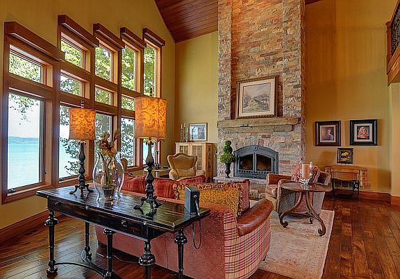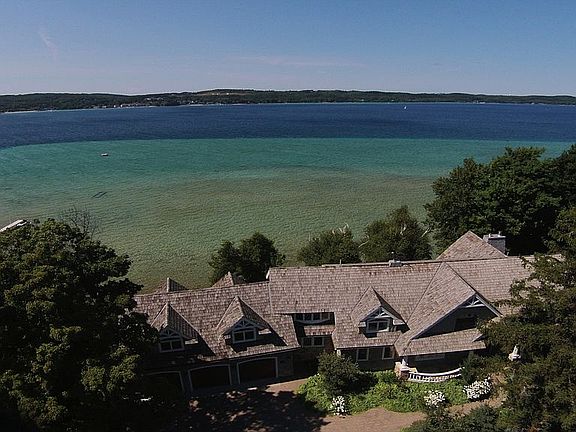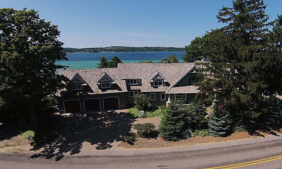 World Class Views from this exquisite home on Suttons Bay's exclusive Stony Point. Over 5200 sq ft of gracious living where quality finishes and luxury combine to create an experience like none other. This home was built for the views of Suttons Bay and boasts 140' of prime frontage. Enjoy the lapping waves of the crystal clear waters, sunrises and sunsets from the large sunroom, decks, patios and nearly every window in the home. Plenty of bedrooms for guests that may never leave! Live in the heart of wine country surrounded by orchards, cherry trees, 5- star dining and boutique shopping..this home is Everything Leelanau yet just 15 minutes to downtown Traverse City.