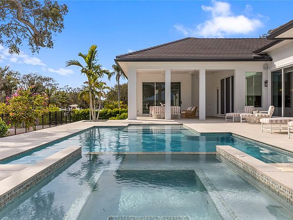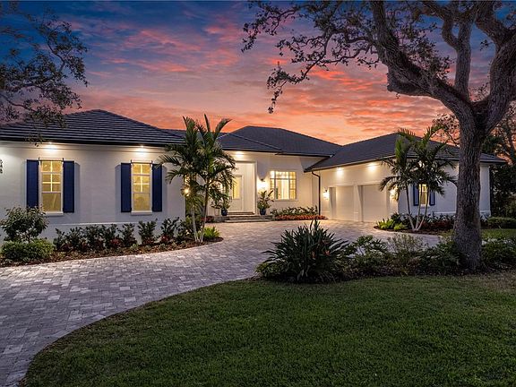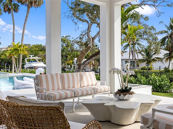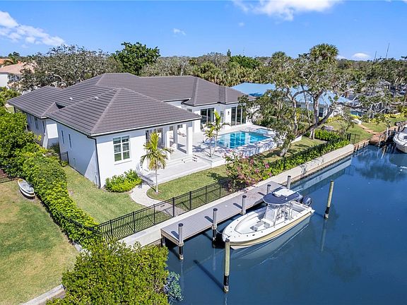 Stunningly beautiful 2023 custom build with incremental investment and improvements in 2024. This single-story open-concept home boasts a luxurious primary suite with water views, his and hers bathrooms and closets, an additional 3 ensuite guest rooms, family room/office + bonus office or workout room. Phenomenal outdoor living/entertaining space, gourmet kitchen w/ storage galore, deep water intracoastal access, high end finishes and natural light throughout. No expense was spared - a rare 100% ready-to-go home! Sizes are approx/subj to error.