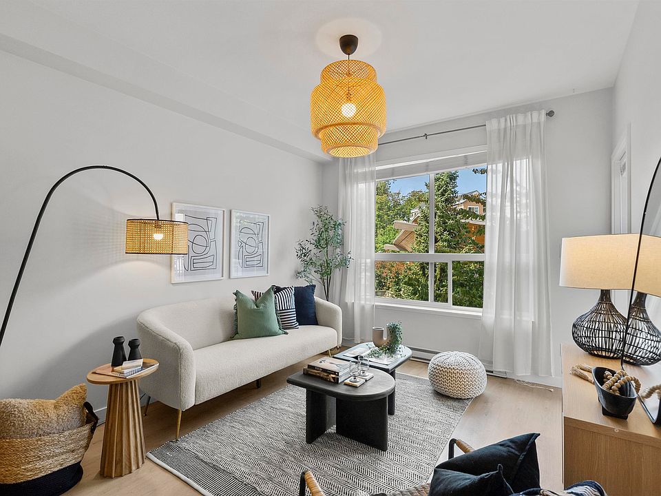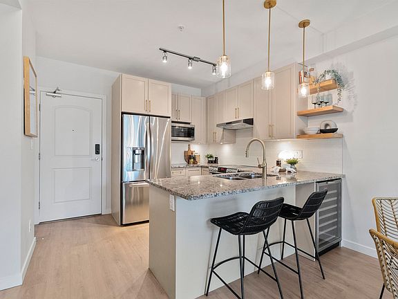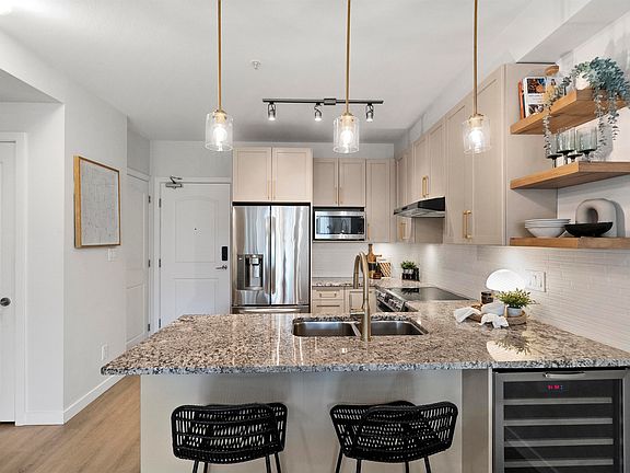 STUNNING 1 bed, 1 bath condo in sought-after Waterstone! Tucked into a quiet central location in the complex, this home offers gorgeous updates throughout. New wide-plank luxury vinyl floors, 9 ft ceilings and oversized windows flood the space with natural light. This kitchen pops with refinished cabinets, new hardware, stainless appliances, updated fixtures, and a built in wine fridge. Enjoy the walk-in closet in the primary bedroom and the comfort of luxurious heated floors in the bathroom. Full-sized washer & dryer included. Comes with 1 parking stall and a roll-up storage locker right behind it for easy access.. Pet friendly up to 2 (combined weight of 44 lbs). Stylish, move-in ready living with incredible amenities at your doorstep including gym, pool, hot tub, sauna, theatre & more!