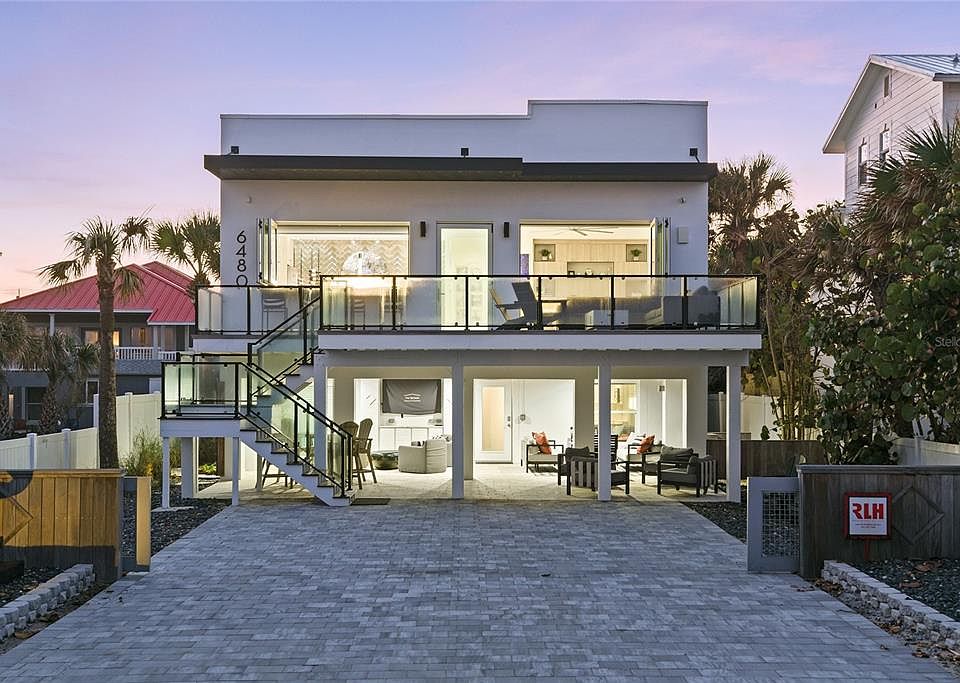 An exclusive oceanfront, gated estate, has been completely reimagined and renovated by renowned RLH Residential. A modern leaning design with clean beach vibes is consistent throughout both residences with state-of-the-art function and materials. This pristine location is in the quiet non-driving beach section, Bethune in New Smyrna Beach known for its sleepy old Florida charm that we all know and love. Sellers combined two properties which resulted in a main house oceanside and guest house on Turtlemound across from the Intercoastal. Sunsets are captured across the intercoastal and the Florida preserve and coupled with incredible sunrises over the ocean. Best of both worlds can be yours on this special barrier island of Florida. The main house renovation in 2022 includes a primary second-story suite and living space on second floor with spacious balcony, and two guest bedrooms, living space and kitchenette on ground floor. The owner's second floor retreat includes a large gathering space with seamless glass sliders opening to second floor deck that allow for panoramic ocean views and blend in the outside. Outdoor living is enhanced with an outdoor fireplace and counter seating from pass-through window from kitchen, makes entertaining a breeze. Designer kitchen includes custom cabinets, Thermador appliances, large center island with seating, dedicated bar and artistic wine wall as the backdrop to a with a full-sized bar. Electric shades allow for ease of privacy while letting soft translucent light filter to spaces. Beach life is easy with spacious primary, spa-influenced bath and incredible closet and storage. First floor of ocean side home features additional bedrooms and living and leads out to the covered walk out patio, great space to shade from the elements and great for weathering summer rains. A 6-7 car-full paver motor court/driveway is also oceanside so parking for friends and family is ample on Atlantic-side drive and two-car garage and parking pad on Turtlemound side. The resort-style center courtyard is where all the fun happens with a private inground fiberglass low-maintenance pool with water slide. Outdoor shower and bathtub for stargazing and taking in the weather that makes Florida desirable. The three-story new construction separate guest house was built in 2023 and rests on Turtlemound Road. The first floor features two-car garage and tons of storage for pool and beach fun. Second and third floors each are mini suites, both floors with living spaces, efficiency kitchens and three additional bedrooms in guest house. This six-bedroom 4.5-bath house can accommodate a large family comfortably. These owners have meticulously designed these spaces, and every detail accounted for. This is an incredible opportunity to own an oceanfront estate that has been built and renovated to stand the test of time. Inquire for a detailed list of upgrades of this unique offering and for a private showing.
