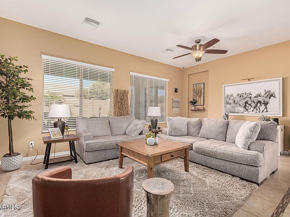Amazing Price & Move-In Ready! Pride of ownership shows in this beautifully maintained single-story home with a 3-car garage, heated pool, and spa! Enjoy peace of mind with a NEW AC (2021) and countless upgrades throughout. Inside, you'll find upgraded flooring, granite countertops, stainless steel appliances, LED lighting inside and out, surround sound, central vacuum, water softener, and ceiling fans in every room. The office can easily be converted into a 4th bedroom! Smart home upgrades include app-controlled thermostat and outdoor lighting, motion-sensor lighting in the garage and laundry, and a high-definition 16-camera security system. The home also features a pony wall removed for an open-concept feel, tiled kitchen backsplash, stainless cabinet hardware, custom wainscoting, laundry and garage cabinetry, and new insulated garage doors. The backyard is a true oasis with a gas BBQ stub, roofline lighting, fruit trees, and a new brick patio designperfect for gatherings day or night! Located in the sought-after Anthem at Merrill Ranch, where resort-style living awaits! Enjoy Big Splash Water Park, a 60-acre community park with an amphitheater and lake, and a 43,000 sq ft community center. Golf enthusiasts will love the Poston Butte 18-Hole Championship Course by Troon Golf. This home truly has it allstyle, comfort, and community amenities beyond compare!