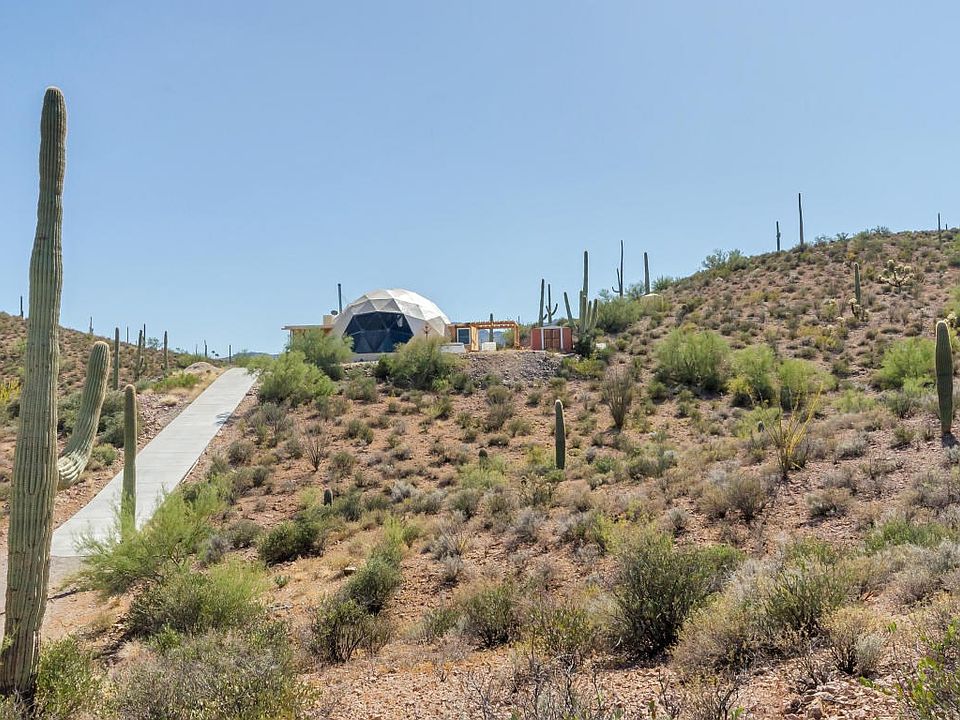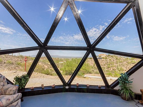Want to live off the grid? Then this is the home for you. 3.3 acres of beautiful desert with the most beautiful sunsets ever! Views galore! Mountain and city! One of a kind hilltop geodesic home. Powered by solar panels with battery backup. Water is hauled and there are water tanks. Utilities are at Sunset Rd. if you wanted to hook up. Very private and peaceful. Enjoy the wildlife. There are 2 bedrooms and 1 1/2 baths. The upstairs master bath can easily be a full bath. Shower is installed but not finished. The downstairs tub is a Jacuzzi tub. Heating is by a wood stove. Panoramic views from your open great room plan. Kitchen has a nice breakfast bar. Enjoy your morning coffee with your mountain and desert views. Water heater and kitchen stove are propane.